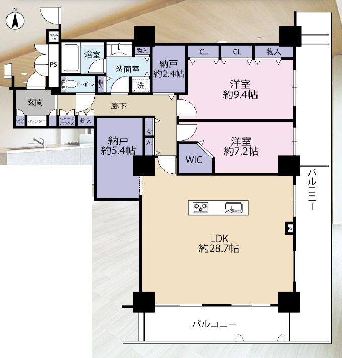 LDK28.7畳 洋室9.4畳 洋室7.2畳 S5.4畳 S2.4畳