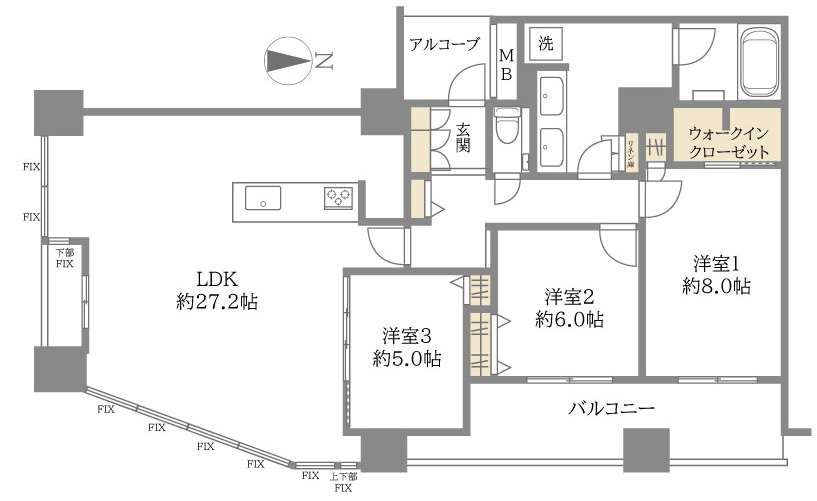 27帖超え広々リビングは一面がFIX窓で眺望・採光抜群。