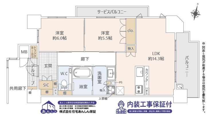 角部屋かつサービスバルコニーがあり、全てのお部屋の採光・通風がよいです。