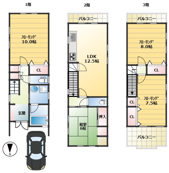 間取内容 洋室10畳 1階   LDK12.5畳 2階   和室6畳 2階   洋室8畳 3階   洋室7.5畳 3階
